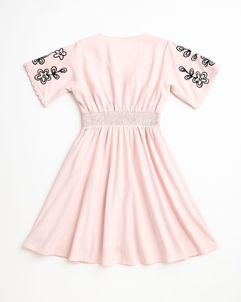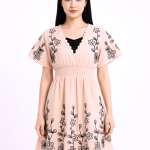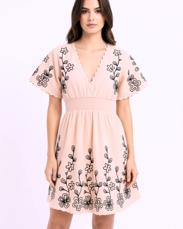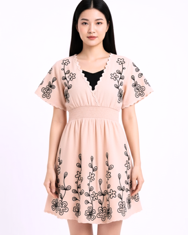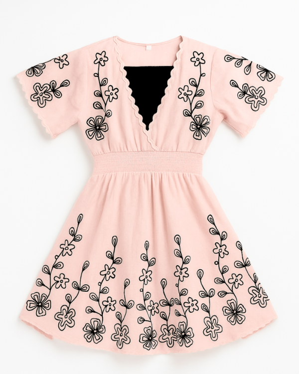 Meet the Blush Bloom Embroidered Skater Dress — a playful yet elegant piece crafted for women who love soft colours, cute silhouettes, and statement embroidery. This charming blush-pink dress features bold black floral embroidery that adds a modern contrast while keeping the outfit sweet and youthful.