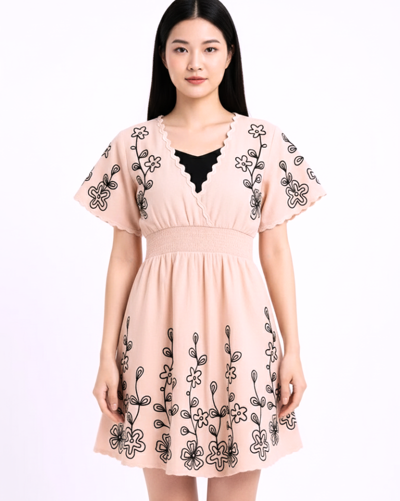 Designed in a flattering A-line skater silhouette, it cinches perfectly at the waist with stretch detailing for comfort and shape. The scalloped neckline and sleeves add a feminine fairytale finish, making this dress perfect for brunch dates, casual outings, travel, or summer events.