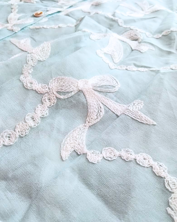 - Color: Mint Blue with Ivory Embroidery