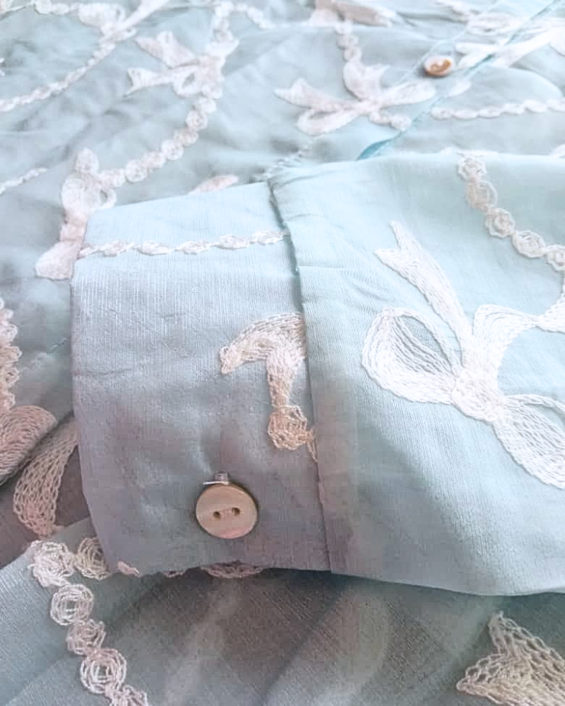 Step into effortless elegance with our Mint Blue embroidered shirt, crafted to bring a refreshing and graceful charm to your wardrobe. The shirt features rich ivory thread work in an all-over floral vine pattern, giving it a delicate yet luxurious finish.