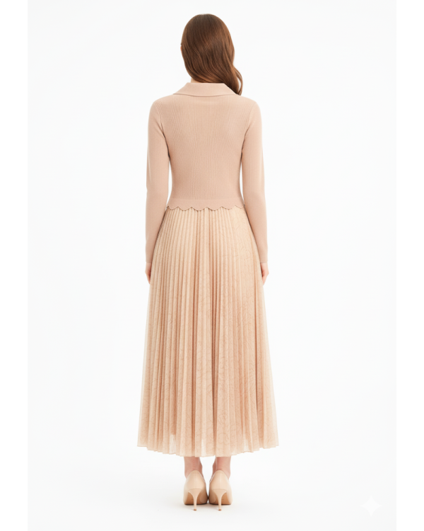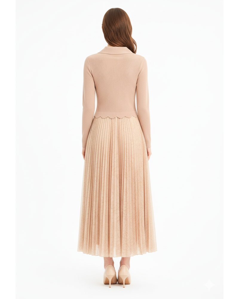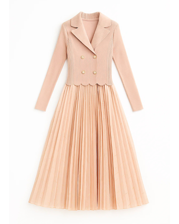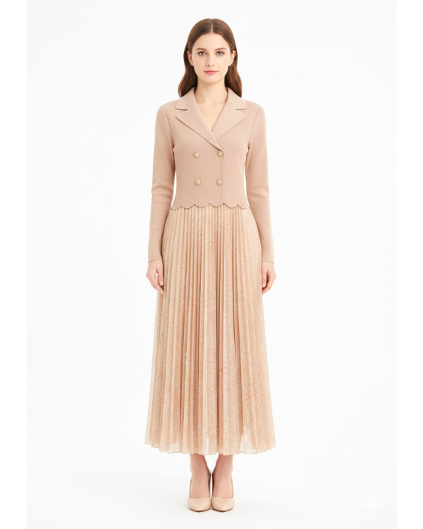 Grace meets sophistication in our Regal Pleated Blazer Maxi Dress — a statement piece crafted for women who love elegance that speaks softly but impresses effortlessly. The top features a tailored blazer-style bodice with structured lapels and gold-tone button accents, while the bottom flows into a beautifully pleated full-length skirt. The soft nude-peach shade adds a refined and timeless charm.